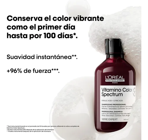 Aplicar uniformemente sobre el cabello húmedo. Emulsionar hasta que aparezca una espuma abundante. Enjuagar bien. Continuar con el acondicionador o la máscara Vitamino Color Spectrum, y el Glass Shine Sérum.